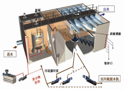 高密度澄清池主要由反應(yīng)區(qū)、沉淀區(qū)以及斜管分離區(qū)組成。